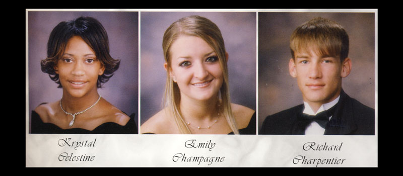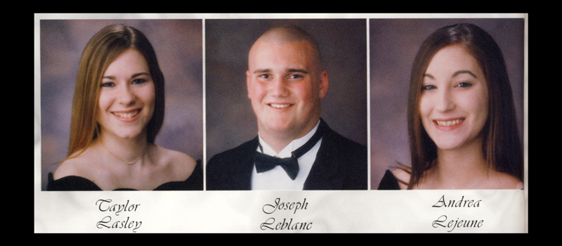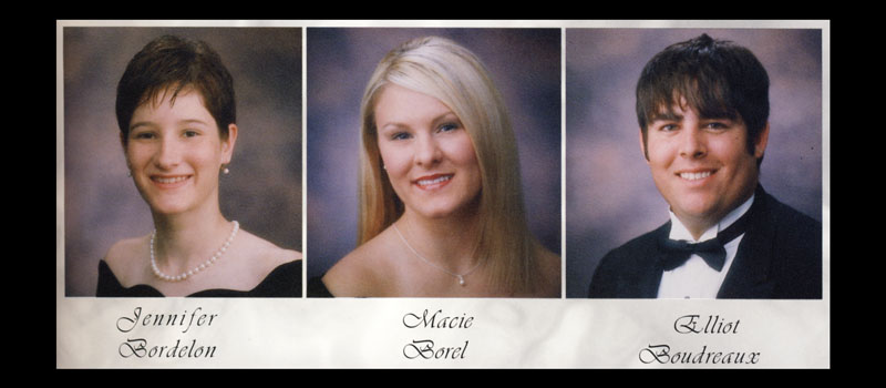 GRADUATESBrandon James Angelle Marilee Robins Ashy Amanda Katherine Bajat Alyssa Clair Beal Matthew Ian Bejeaux Benjamin Blake Bell Rusty James Benezech Derek Paul Bergeron Ashley Elizabeth Berkenmeier Jenifer Elyse Bordelon Macie Lynn Borel (Brown) Elliot Thomas Boudreaux Ashley Joan Boustany (Dugal) Zack Arthur Brazda Brittany Page Brazee Chet Daniel Breaux Valarie Danielle Breaux Brooke Leah Brodhead Daniel John Brown Timothy John Brown Markashia Sharda Bruno Arnold James Burke, Jr. Jeremy Ross Calais Shana Ashlei Callais Lauren Alaina Camel Michael James Campora John Rider Caro Krystle Jeneé Celestine Emily Marie Champagne Richard Roch Charpentier Brandi Lé Chavez Megan Elizabeth Cobb Kathryn Davis Courville Kacie Jane Cryer Carrie Elizabeth Davidson Katy Elizabeth Dease Sadie Lynn DeRouen Trent Jacobi Domingue Dylan Paul Doré Lauren Rebecca Ducote Ashlee Dale Duhon Sarah Danielle Duhon Michael David Dunn Lindsay Claire Ezell Trey Michael Falgout Meagan Marie Fogelman Charles James Fontenot Christopher James Fontenot Jessica Lynn Forestier Franco Gaudry John Charles "JC" Gibbons Lauren Ashley Guidry Tracy Nicole Guilbeau Daniel "Cy" Cyrus Guillory Savri Angelle Guillory Brad Jude "BJ" Hayes, Jr. Angelle Renee Hebert (Dueitt) Kelli Michelle Hebert (Camel) Kellie Lynn Hebert Randy Phillip Heidbrink Daniel Christopher Iorio Janna Marie John Jeremy Merrell Johnson Christi Ann Jordan Lakelsha Jamie Joseph Sara Louise Judice Kara Alyse Keigley William Byrne Kurtz Clayton Anthony LaJaunie Desiree Elizabeth Landry Lynsey Renee Landry Mary Elizabeth Landry Tory John-Lennis Landry Taylor Lynn Lasley Joseph Gary LeBlanc, Jr. Andrea Beth LeJeune Lorali Lemaire Justin Thomas Maddox Kathryn "Katie" Elizabeth McConnell Ty Brittan Hardy Meche Nathan James Mehal Lillian "Lily" Grace Mestayer Danielle Nicole Miller Ryan Joseph Millett Elizabeth "Liz" Patricia Mingo Adrienne Lea Morain Randall "Randi" Nicole Morrison Myndal James Munro Lauren Elizabeth Naquin Raquel Jené Naquin Ganer Lee Newman, IV Michelle "Shelly" Noel O'Neal Lauren Nicole Olivier Hayley Elizabeth Parker Teren Elaine Parrino Michael James Pearce Rudolph Herman "RJ" Perciful, Jr. Jared Scott James Perrio Stacey Leigh Perrodin Adam Kraig Peterson Stevie Marie Poirrier Dustin Gerard Prejean Jules Whitney Quibodeaux Sara Lauren Rabalais Blake Michael Richard Matthew Cade Robichaux Elise Acheé Romagosa Tiffany Nicole Schneider Brynne Elizabeth Scott Abbey Paige Scrantz Casey Leigh Sehon Erin Lindsay Shelton Ssmantha Leigh Simmons (Webre) Matthew Christopher Smith Jared Michael Sonnier Joshua Joseph St. Pierre Ty Jude Stuart Kevin Joseph Suir Alex Christopher Tanner Jacob Darral Tauzin Holly Reneé Taylor Bernard Cornelius "BC" Thibeaux, III Amber Celeste Thibodeaux Madalyn Maydel Thibodeaux Warren Jake Toups Heather Reneé Trahan (Trappey) Erin Michelle Venable Annie Kathleen Viator Samantha Grace Villejoin Celia Kathleen Vinturella Duriel André Watson Katherine Alicia Weaver Rod Joseph Wiltz, Jr. Austin James Zaunbrecher